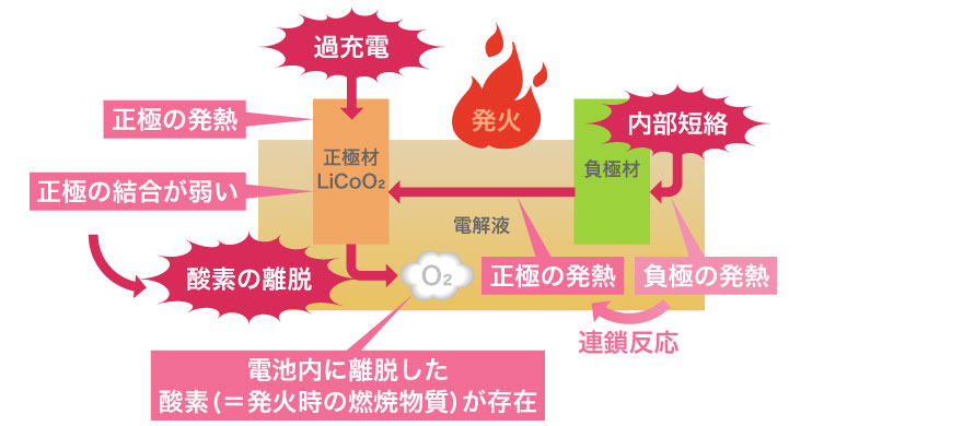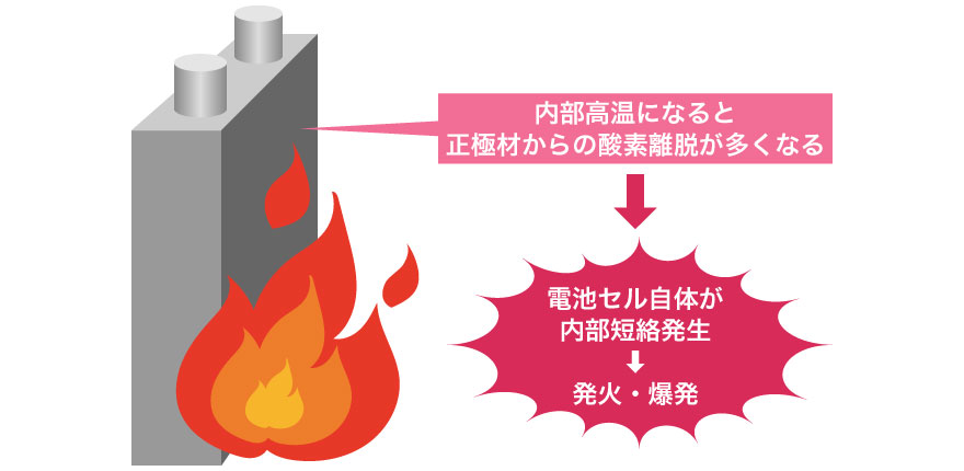 正極材にコバルトなどを使用した三元系リチウムイオン電池は、充放電中に発熱します。過充電や内部短絡など様々な要因で熱暴走を起こし、発火や爆発を起こす危険があります。