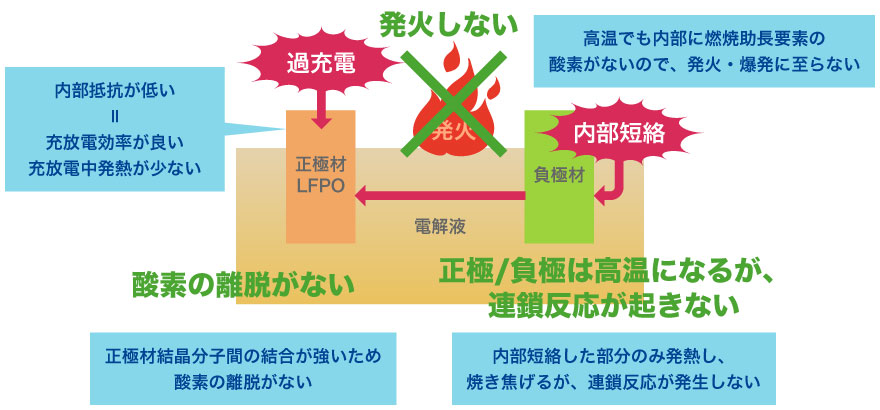 FECORAGE(フェコレージ)はリン酸鉄リチウム(LFP)を正極材に使用した「リン酸鉄リチウムイオン電池」です。リン酸鉄リチウムイオン電池は過充電や短絡不良が発生しても発火や爆発をおこさない、非常に安全なリチウムイオン電池です。