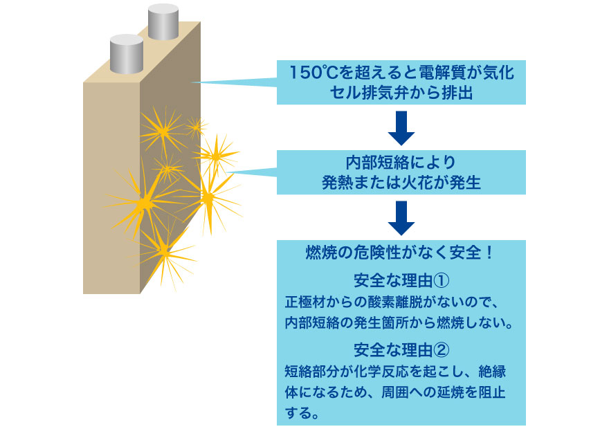 火災などの高温下においてもリン酸鉄リチウムイオン電池は高い安全性が実証されています。