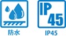 - IP45:直径1mmの針金形状のものが入らない。いかなる方向からの水の直接噴流に対して影響を受けない。