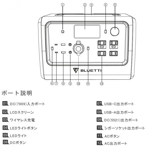 - 出力は正弦波AC100Vのほか、DC、USB-A、C、ワイヤレスも対応