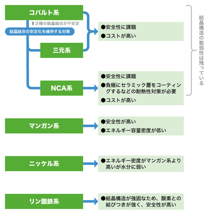 現在市場に流通しているリチウム電池は大別すると、「コバルト系(三元系、NCA系)」「マンガン系」「ニッケル系」「鉄系」の5種類です。