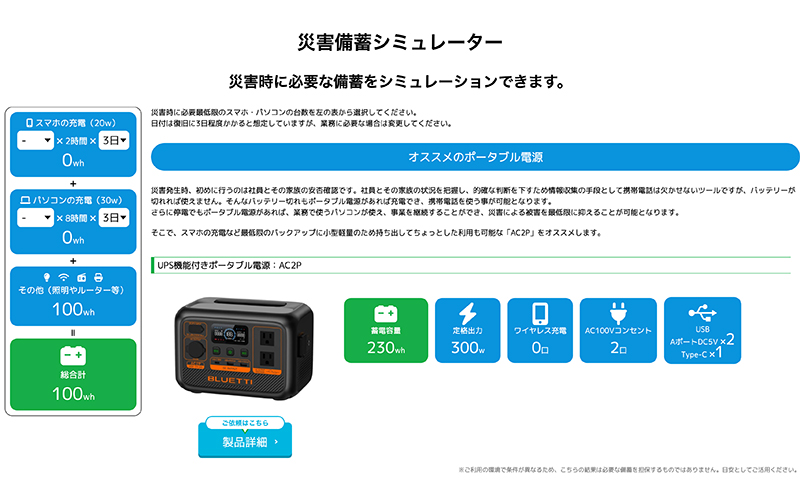 現在、様々なメーカーが様々なポータブル電源を提供していますが、どれを選べば良いかわからないと、多くのご相談をいただきます。そこでEcoSubscでは「災害備蓄シミュレーター」を提供し、非常時に最低限必要な電力に合わせて、ポータブル電源を簡単に選ぶことが可能です。