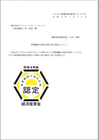 株式会社カイレン・テクノ・ブリッジ(本社:埼玉県所沢市、代表:洪崇富)は、防災・減災の事前対策に関する計画を経済産業大臣が認定する「事業継続力強化計画」について、令和4年度に認定されました。
